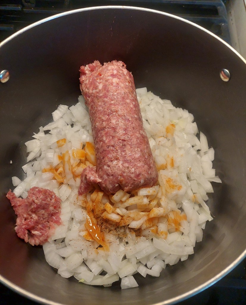 Add whatever spices you want (I used hot sauce, cayenne, salt and pepper) and then throw your meat on top. You can crumble it ahead of time if you want, but I prefer to break it up as it’s cooking.