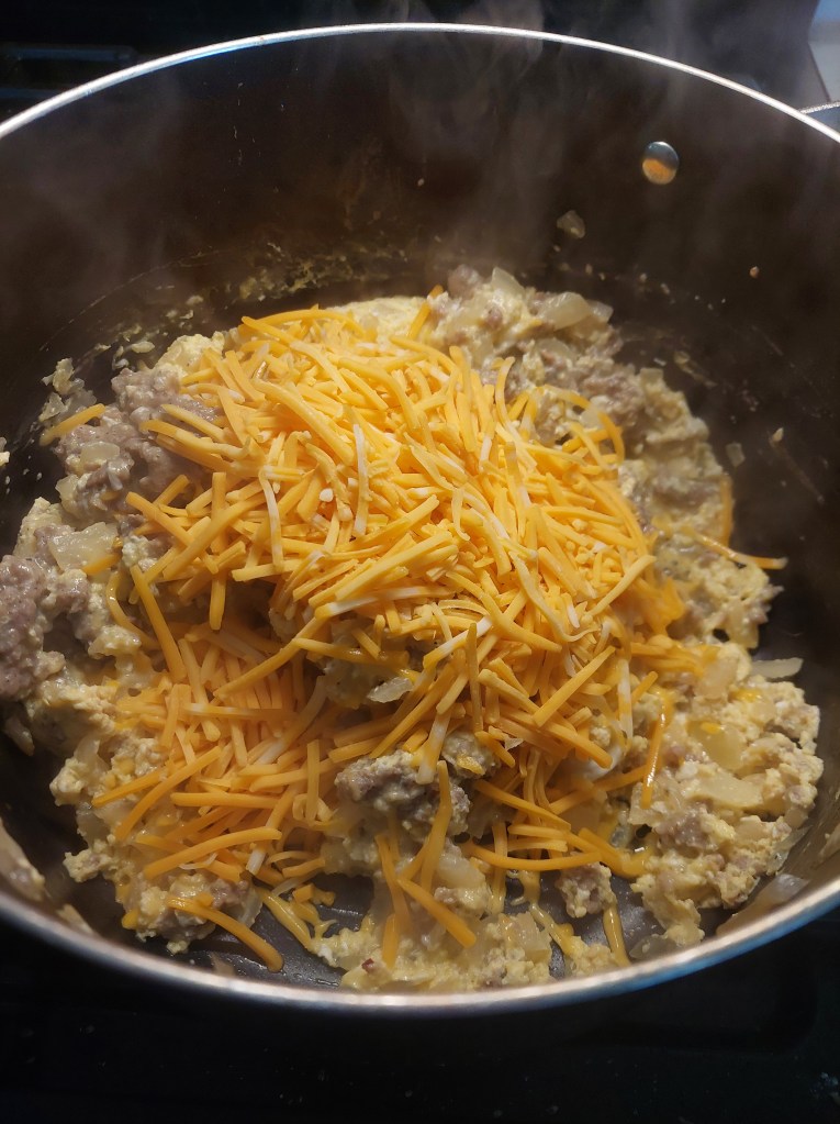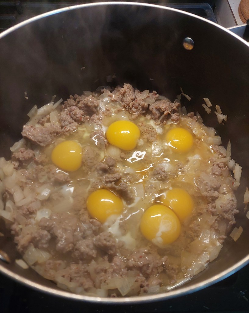 Once the meat is cooked add in your eggs. You can scramble them ahead of time, with some milk, the whole nine yards, or you can just dump them in your pot and save the dish. Break the yolks and mix to combine.