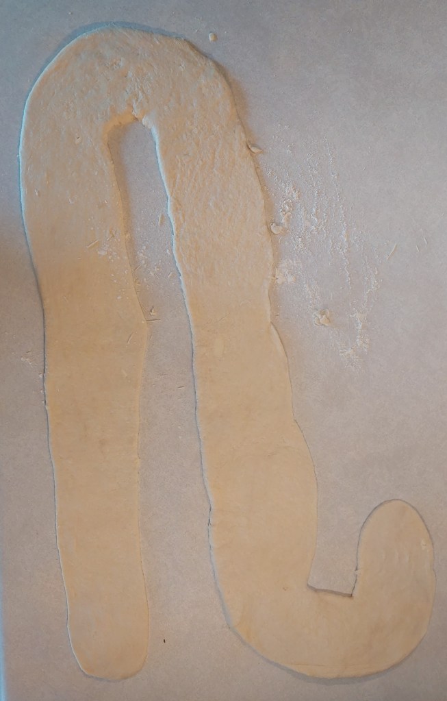 So I take out my dough, roll it into a long strand and then use a rolling pin to flatten that out into dough that’s roughly four inches across.