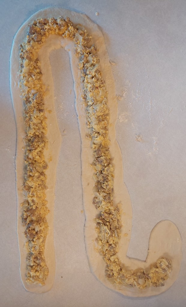 Take your filling and attempt to place it evenly down the middle of your dough, it’s dough so there will be some play at the end of this, but try to work fast as you may begin to melt the butter in the dough faster than you would like.