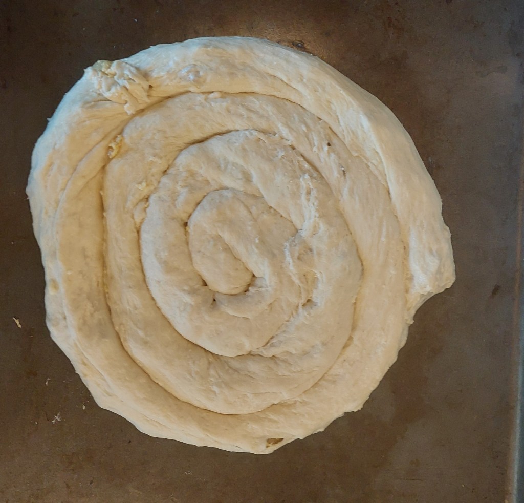 Now you’ll want to take edges of the dough and fold them over themselves so that all the filling is inside and the dough forms a smooth covering around it. If you chose a shape that isn’t a spiral then I would recommend crimping/compressing the edges of your shape so that nothing explodes out during the cooking process.