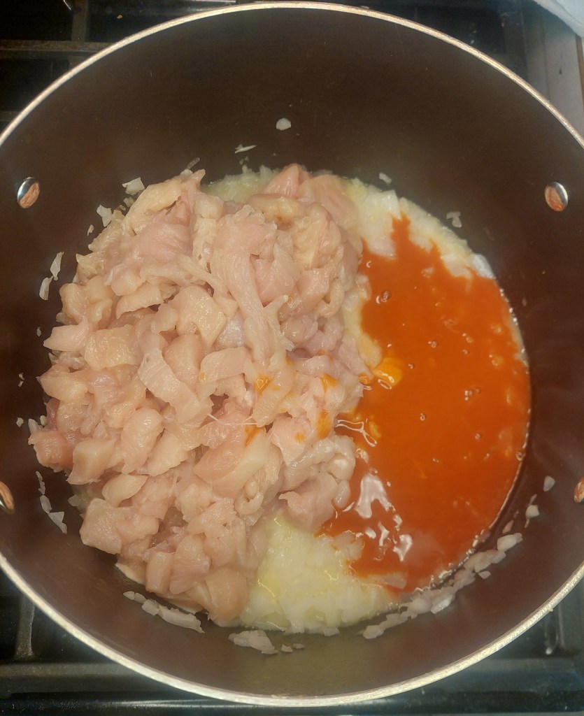 - Add chicken and hot sauce to onions, change heat to preferred chicken cooking temperature