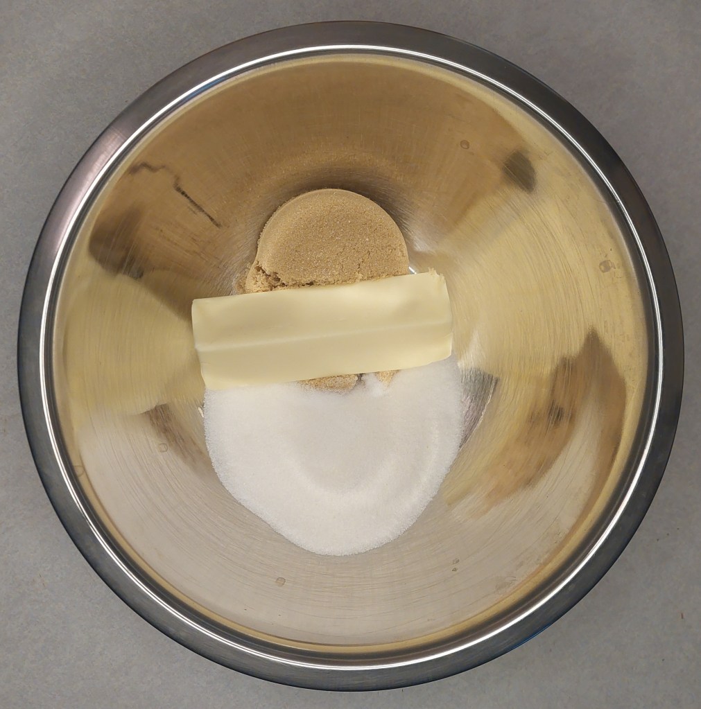 Combine room temperature or softened butter in a bowl with your two types of sugar. This process is called creaming, which just helps to incorporate some air your mixture and will give your cookies the signature texture.