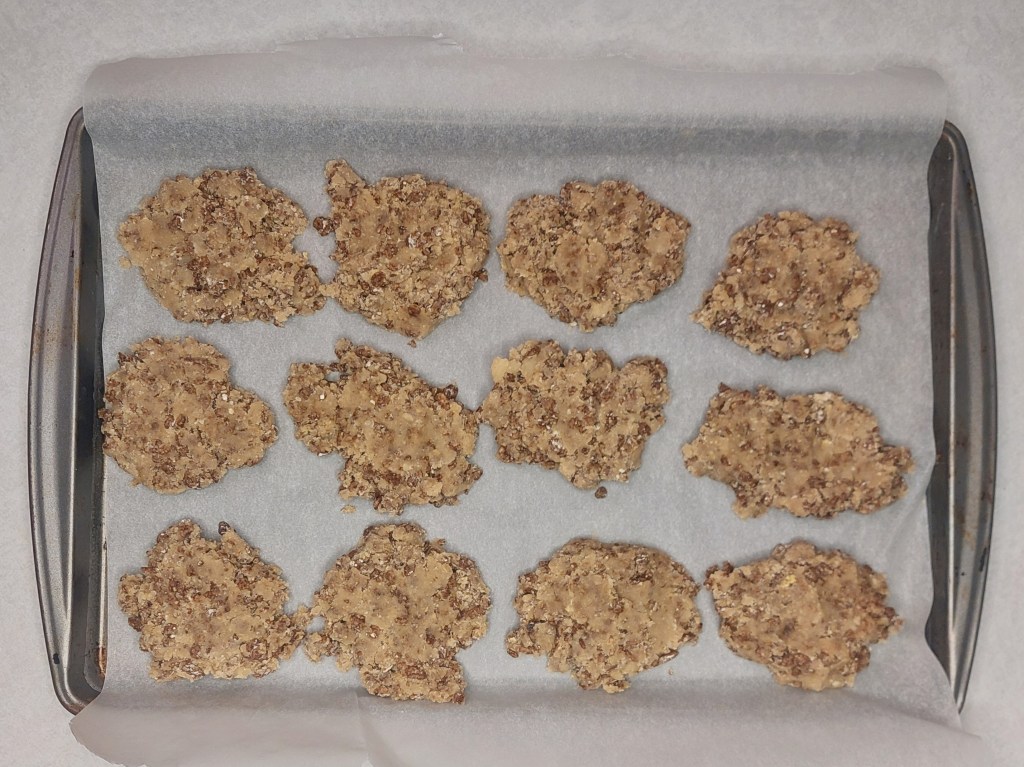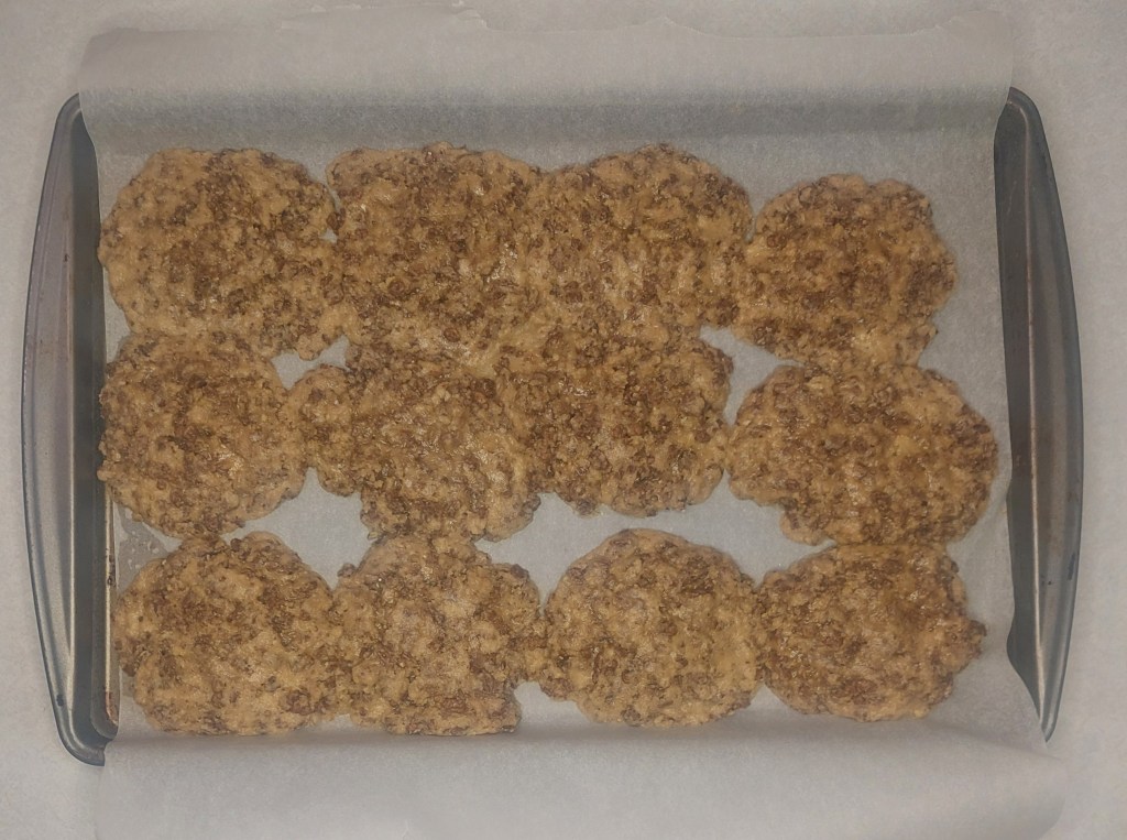 Turn your oven to 350 degrees Fahrenheit and scoop out your dough into 12 balls (on in my case disks). You want to leave as much room as your baking tray allows between your dough. If you want to make 24 cookies instead of 12 then feel free, just bake them for a little less time.