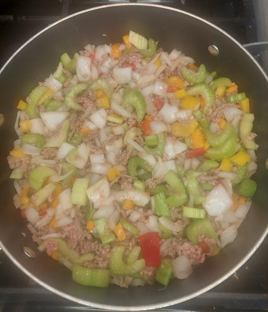 - Add your chopped vegetables and continue cooking until meat is completely browned
