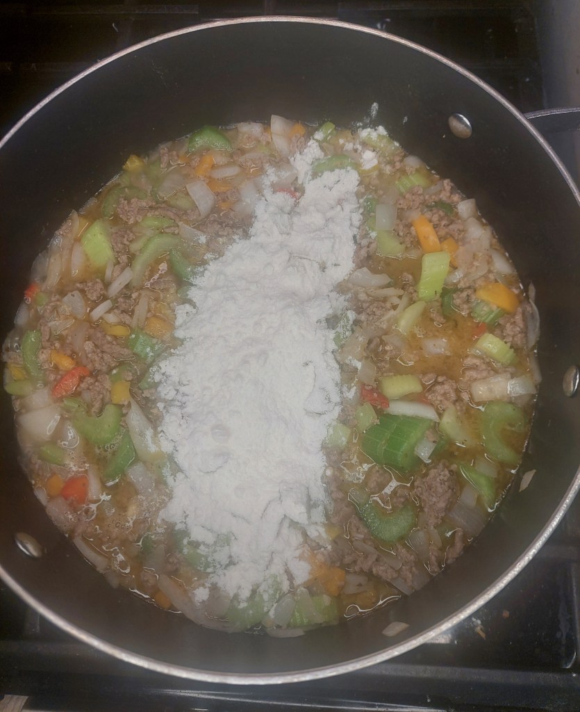 Now we want to add in our flour (cornstarch would also work). The goal is to create something that is thicker than water, but still a liquid. We’re not making a roux, just thickening the water in the pot.