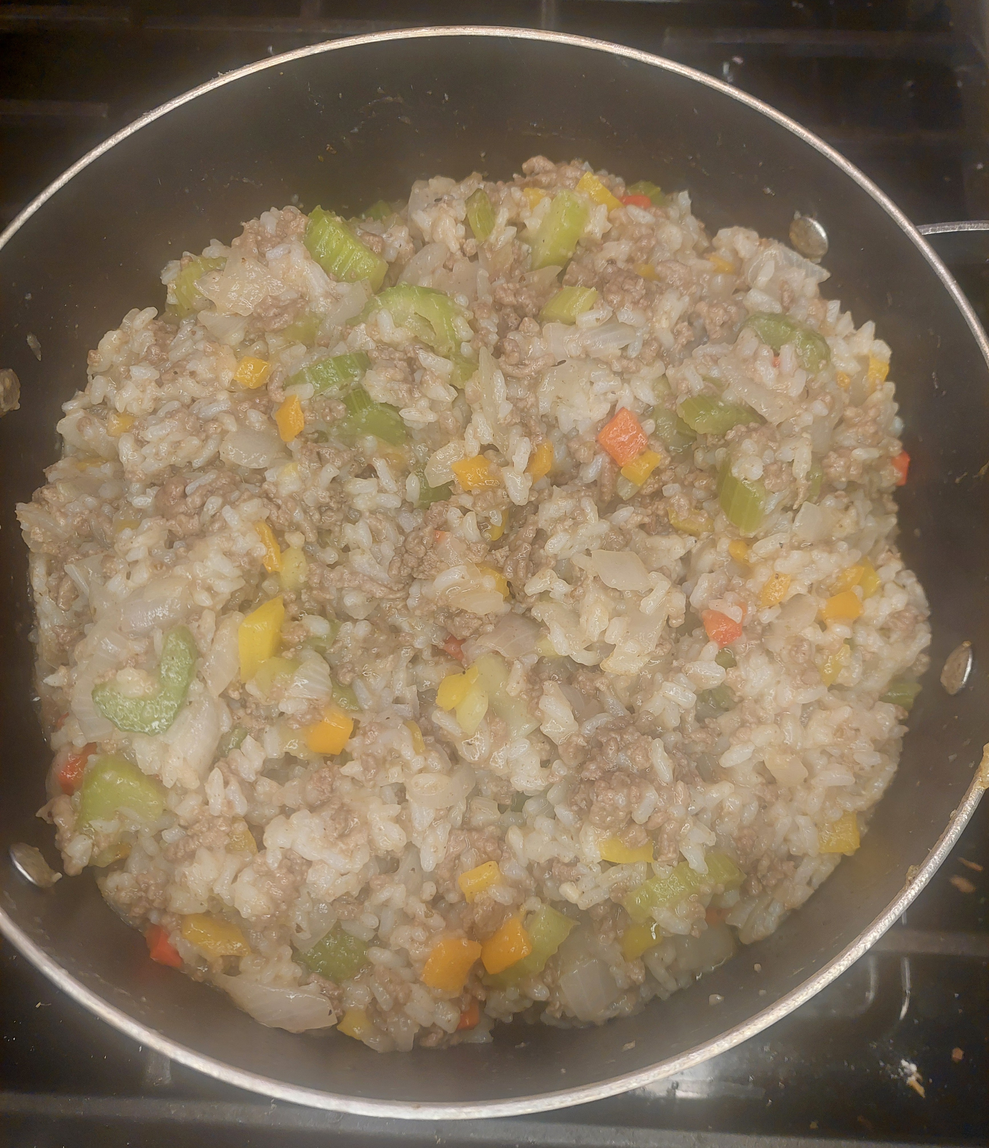 You’ll want to mix everything together and the rice should begin to take on a brown color. This is why it’s called “dirty” rice. The final color is dependent on what ingredients you used where. If you used the chicken livers that this recipe has historically been made with you’ll be able to achieve a nice rich brown, if you used ground beef it’s likely going to be closer to white than brown.