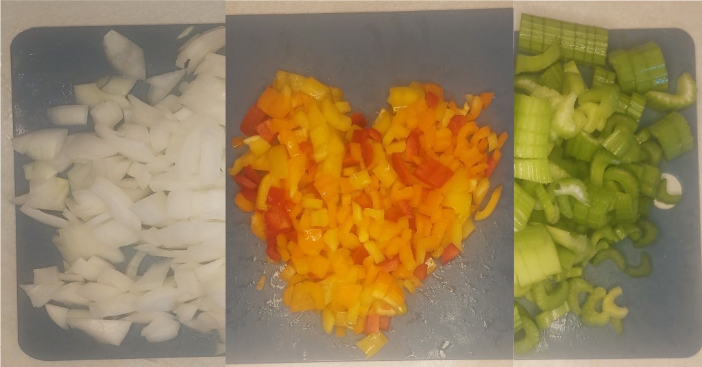 - Chop your onion, celery and bell peppers (and garlic if present)