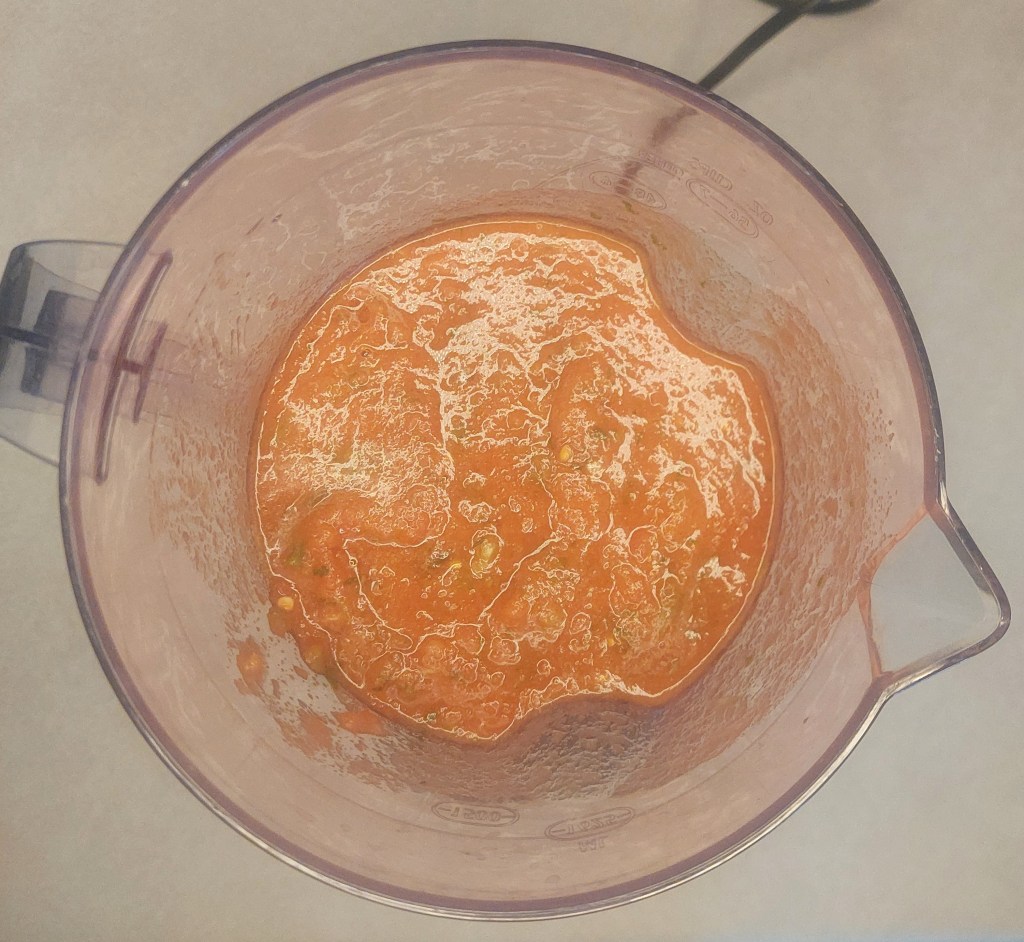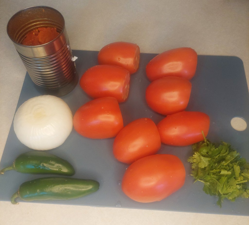Cut the ends off the tomatoes, drain the canned tomatoes, tear the cilantro, measure out your spices, cut the onion and throw everything into the blender.
