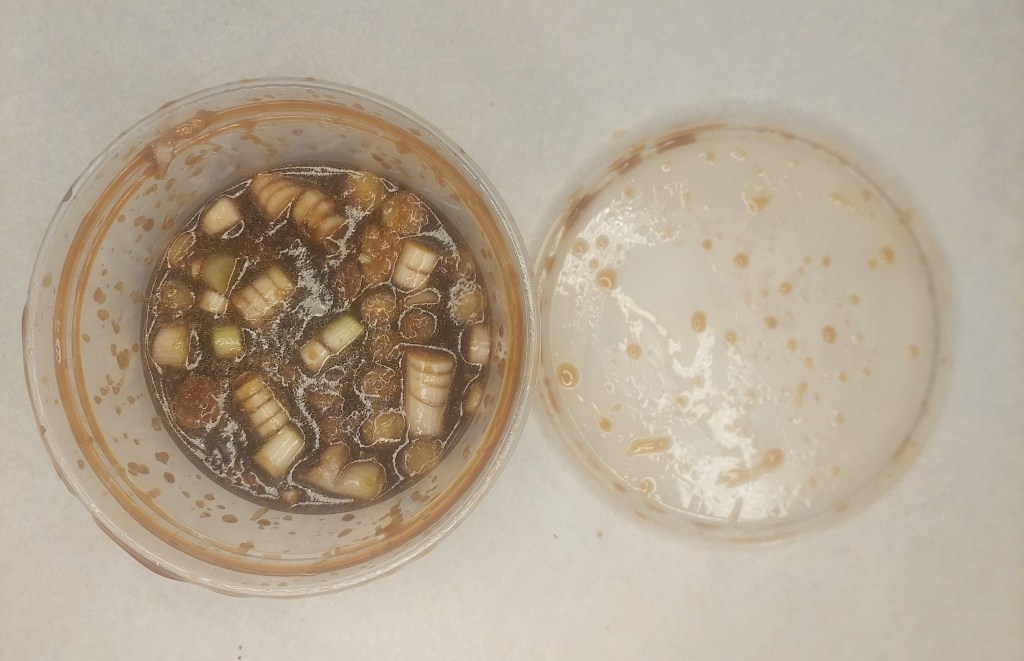 Before you give me a hard time for using a “fancy” bowl, this is an old Indian takeout container. I like the lid because it makes mixing easier (throw it on and shake it up).
