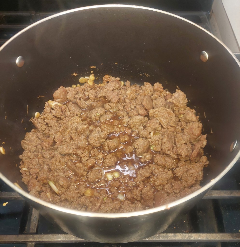 Dump in your soy sauce mixture, and cook until the meat starts to take on the darker color of soy sauce. It should smell really good in your kitchen at this point.
