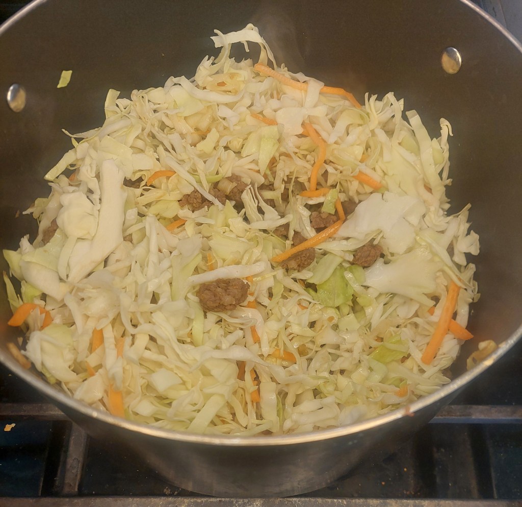 Throw in your cabbage/coleslaw mix. I personally like the coleslaw mix for the carrot, but the cabbage is the real star. Next “sautĂ©” which is just a fancy way of cook in fat (which is one of the reasons I like pork for this dish, more fat).