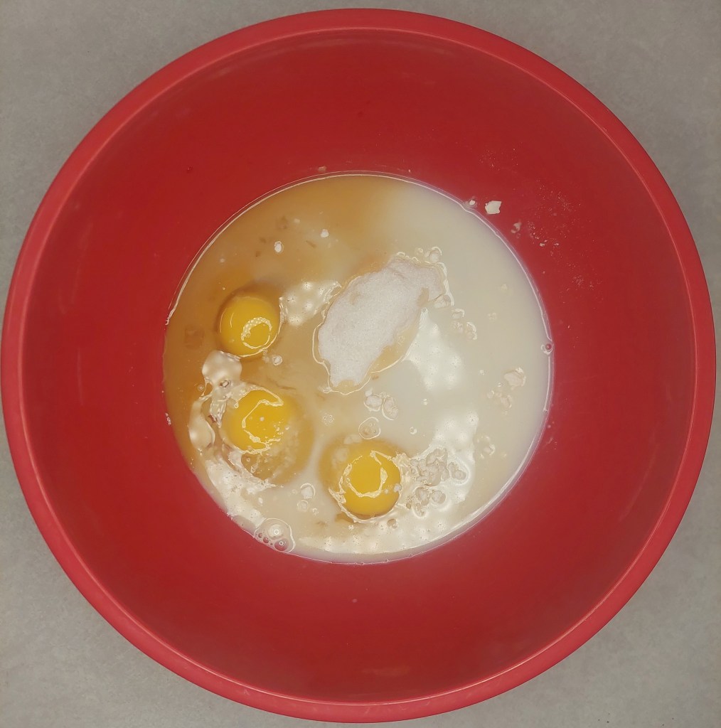 Start by adding all your ingredients to a bowl (this is the eggs, flour, milk, sugar, salt and vanilla extract).