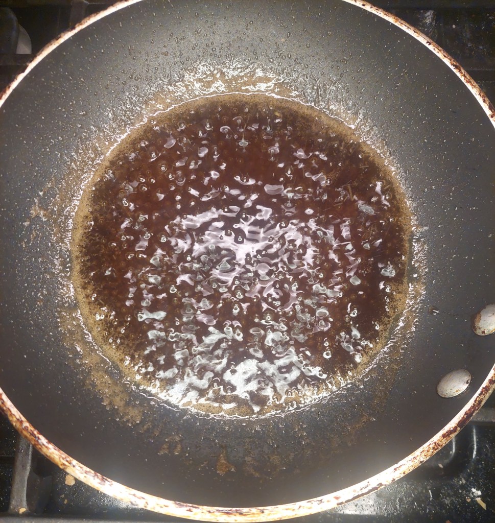 I also at this time started the butter for the caramelized bananas melting in a pan. Once it was melted I added the brown sugar (and wasn’t paying attention so I accidentally doubled the amount that should have been there). Once the sugar and butter is combined add a splash of water to loosen the resulting mixture into a more syrupy consistency.