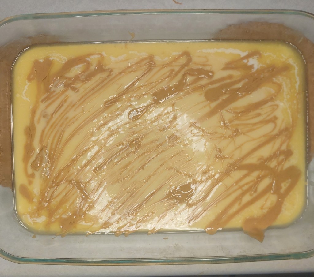 - Pour batter in dish, drizzle peanut butter over the top
