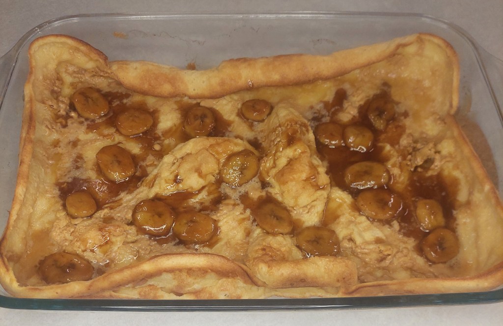 - Place bananas and remaining syrup on top of Dutch Baby