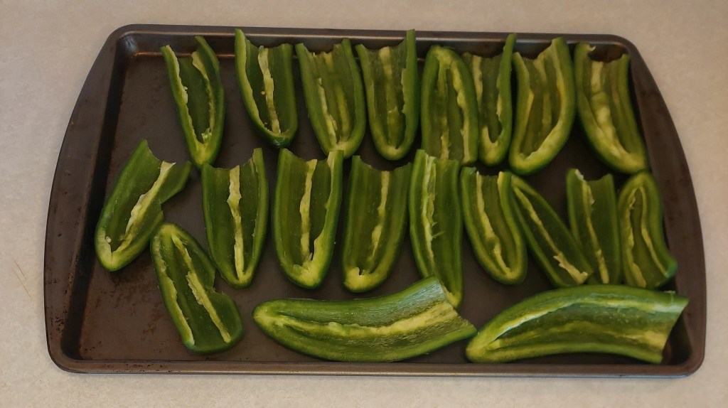 Wash your peppers (with water), then cut the ends with the stem off the end of the pepper. You should then be able to stand them up on the flat end you just created, then you can cut right down the center of the pepper. You can probably then use a spoon to scoop out the inside but I haven’t found a better tool than my thumb to pull everything out (please wash your hands after if you choose this method).