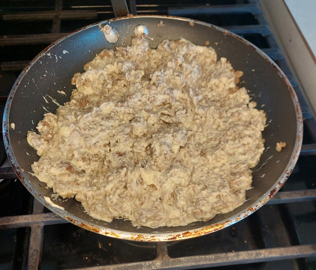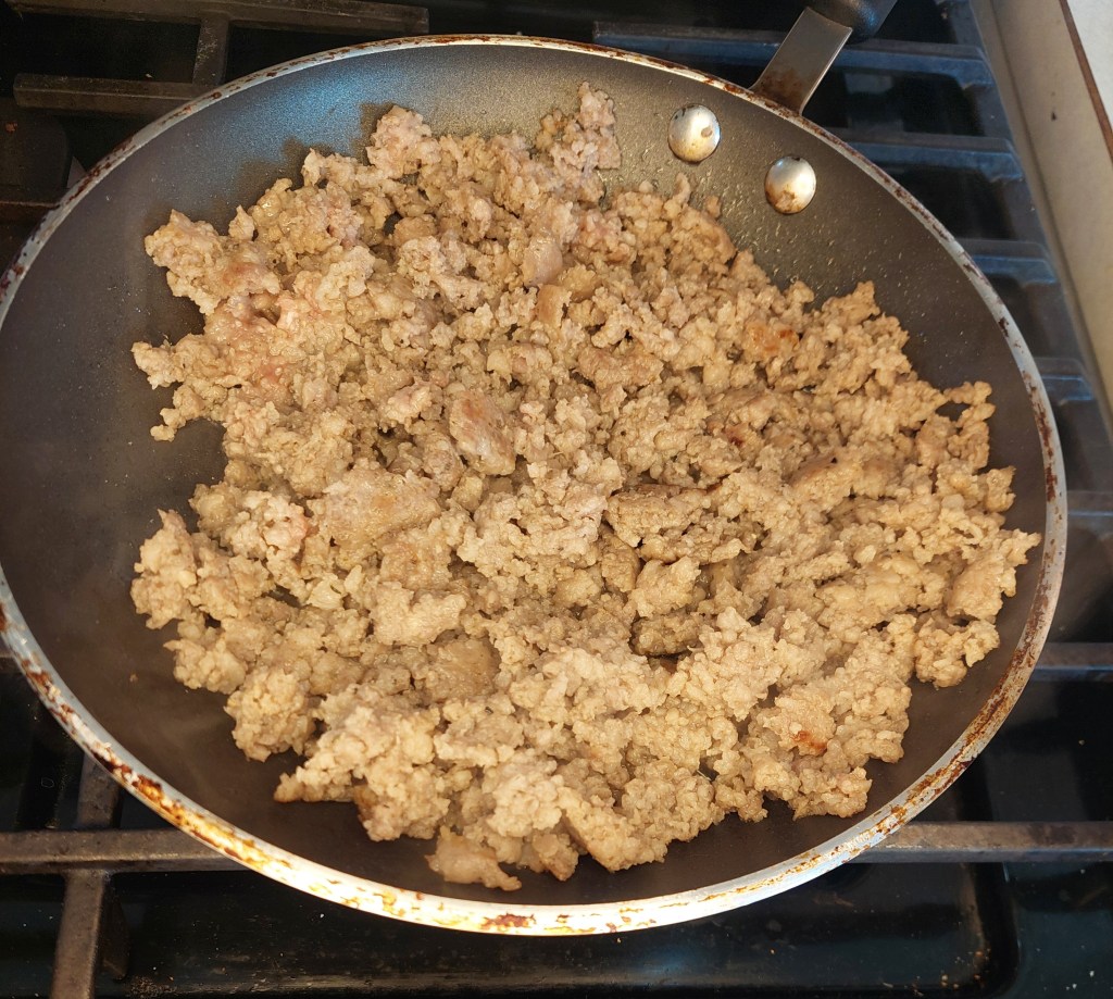 Either while you’re splitting peppers or afterwards you should throw your sausage in a pan and cook it. Generally I try to create smaller “crumbles” but it really doesn’t matter so long as it’s cooked and it fits in your peppers.