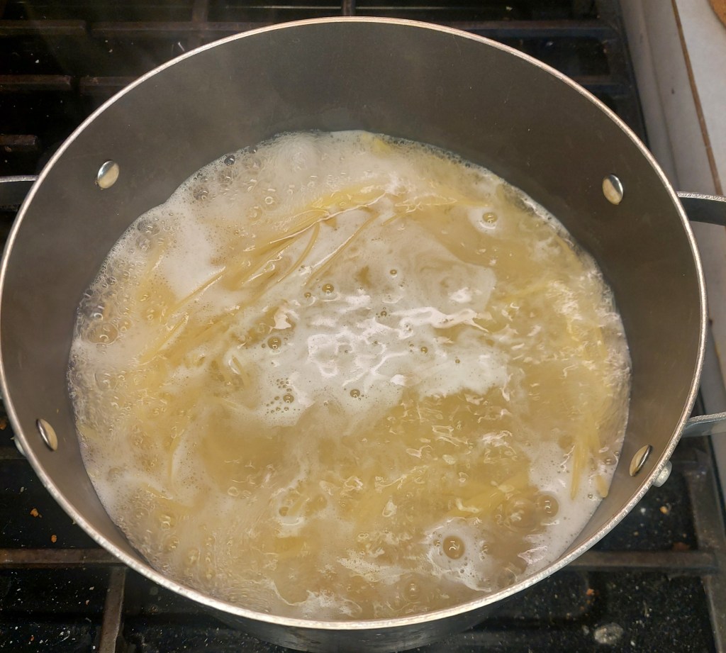 Boil a pot of salted water, add your pasta and cook until it’s cooked through. Before you dump out the pot save a cup of pasta water.