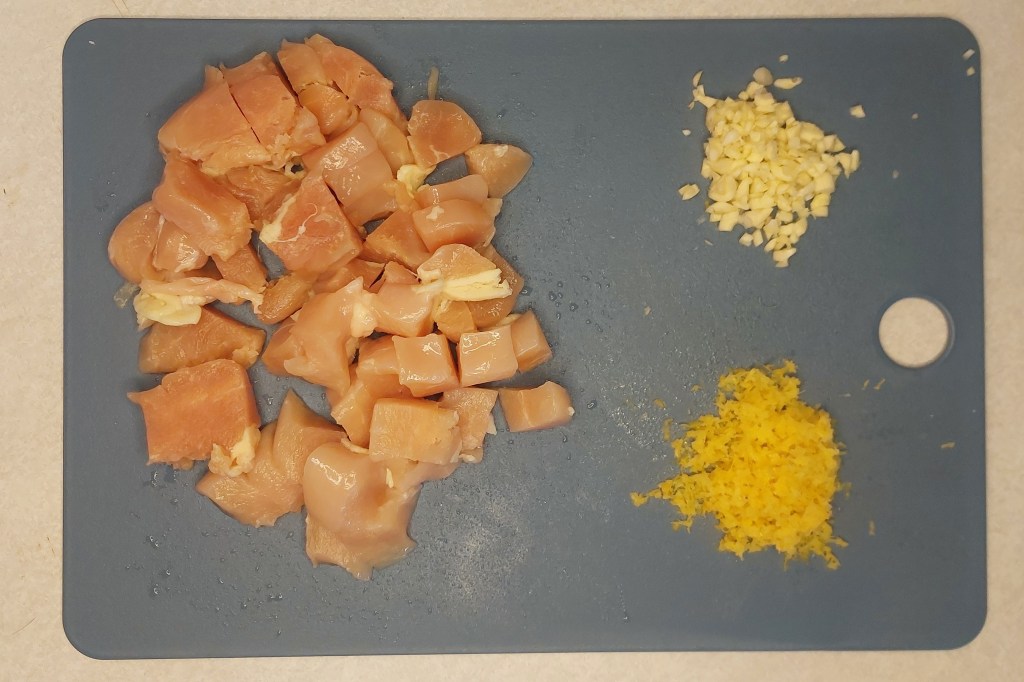 - Cut chicken into bite sized pieces, finely chop garlic and zest your lemon
