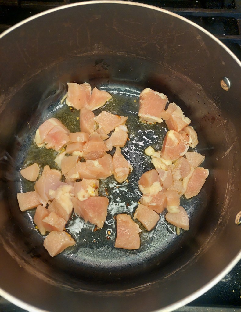 Cover the bottom of the pan in olive oil, turn the heat to medium, add your spices to the oil and stir until you can smell them and then add your chicken.