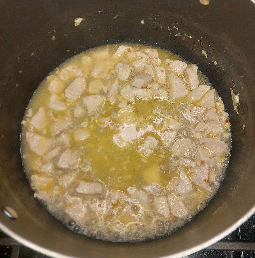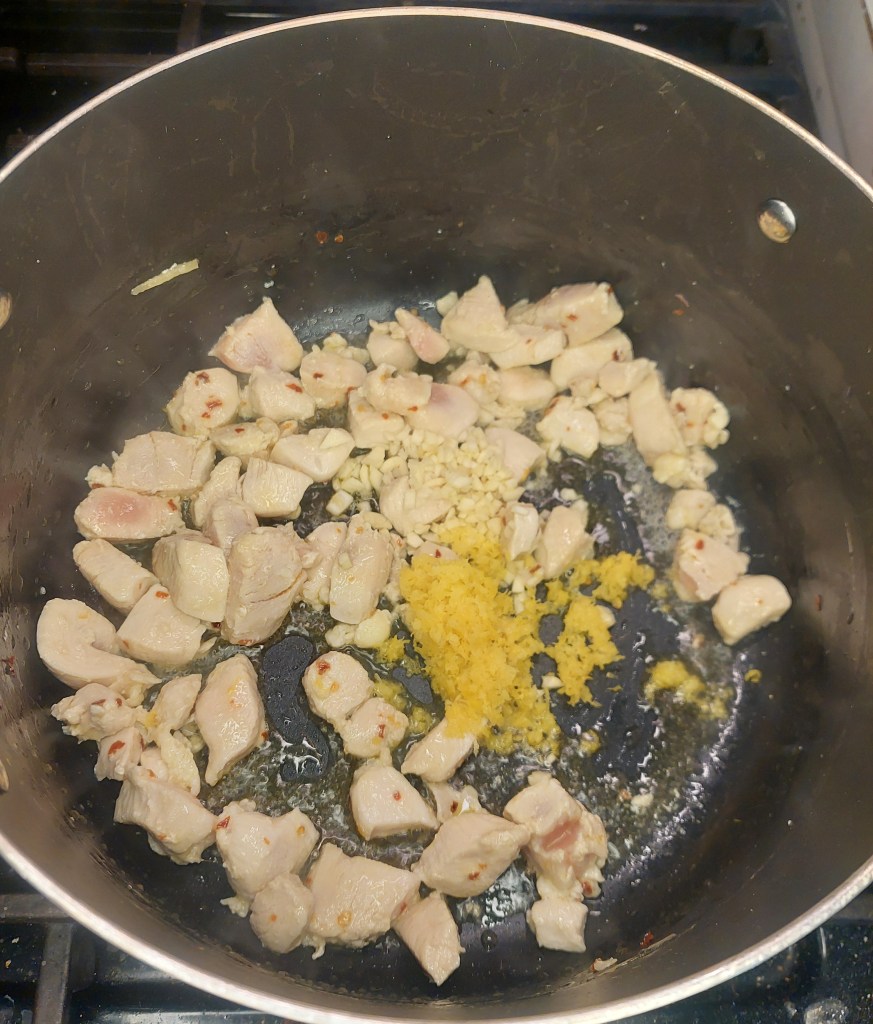 - Once chicken is cooked add in garlic and lemon zest and stir to combine