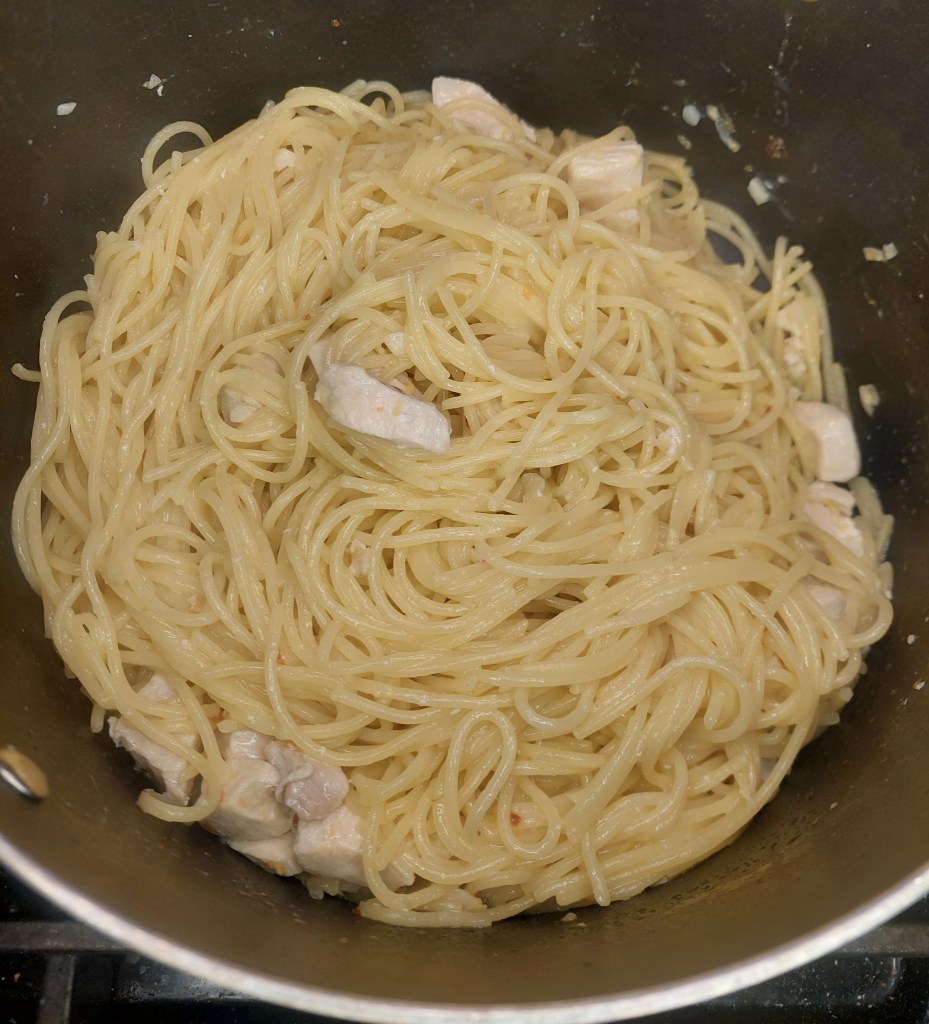 Add your pasta back in and stir it all together. Ideally there’s enough liquid left for you to coat the pasta. A good test for this is to grab a noodle and see if it tastes like pasta or lemon. If it doesn’t taste like lemon (or as lemony as you’d like) see if you can squeeze any more juice out of your lemon.