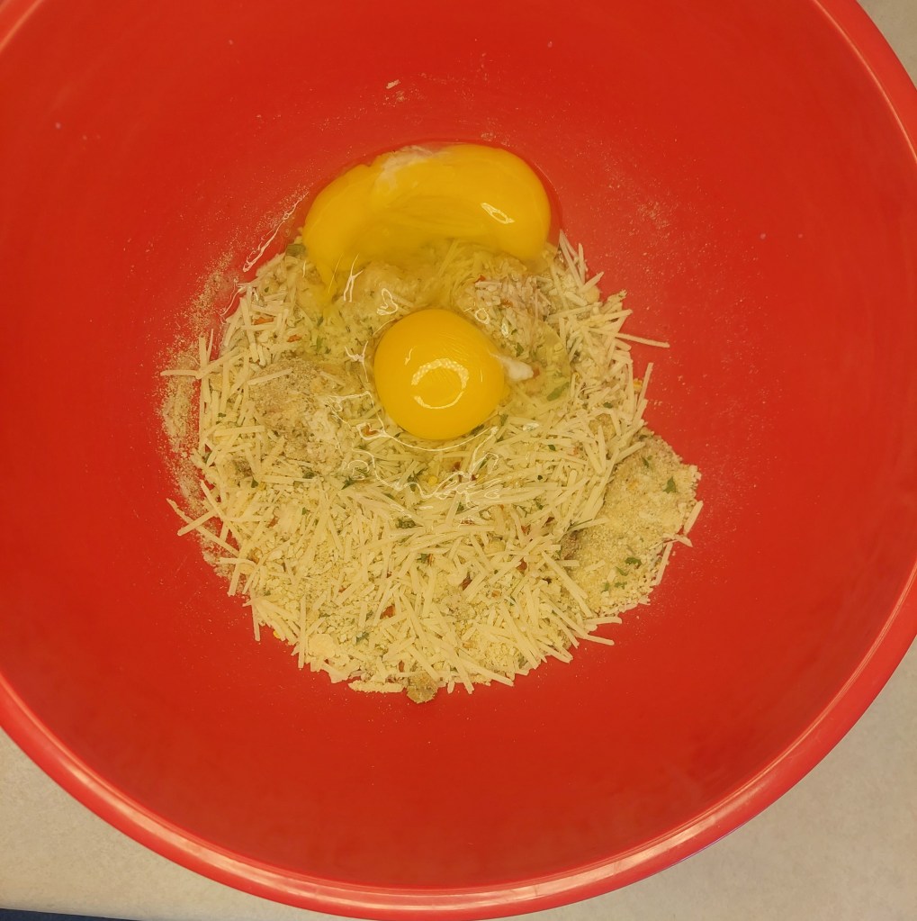 Do you need to mix these beforehand, probably not. I find that when I don’t that I’ll get chunks that are all garlic, or all breadcrumbs, etc. So this makes them more even meatballs.