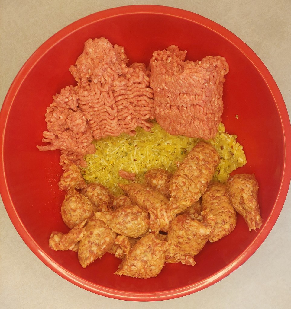 I went for a 50%/50% split of Italian sausage and ground beef. If you like one more than the other than feel free to use whatever proportions you want, but keep it at two pounds, otherwise the ratio will likely be off.