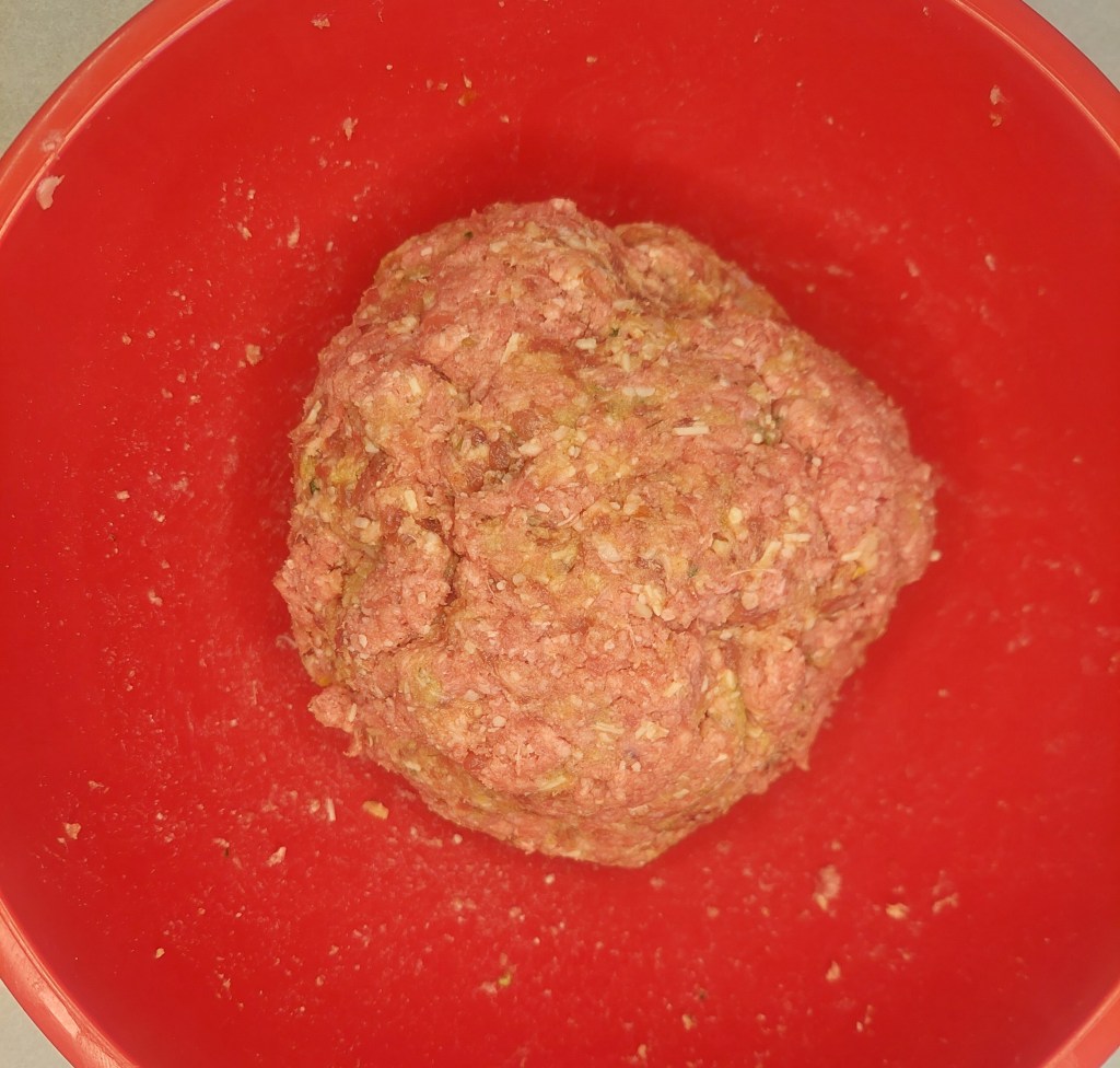 Be careful not to overmix the meat, we’re not trying to tenderize it. I’ve found that the best method is to just spread your fingers and stick them into the middle of the meat and then rotate your hand clockwise or counterclockwise. You should get a roughly even consistency throughout.