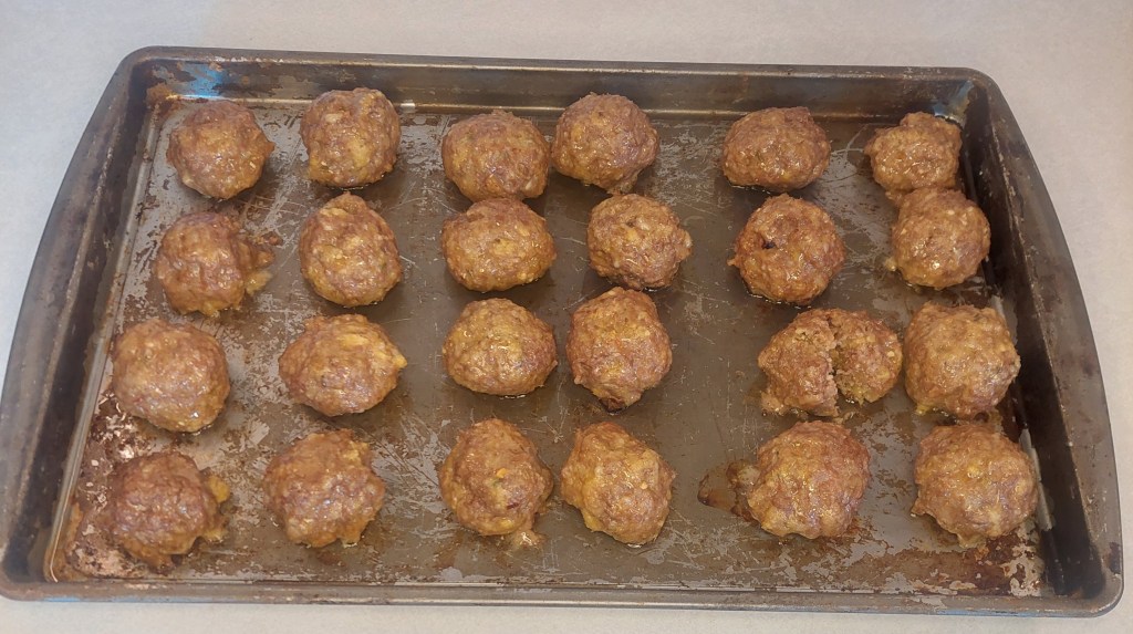 Now comes the hardest part, trying to make evenly sized meatballs. I’d say my 4th column was my most consistent but that was pure dumb luck. Because I said the recipe made 24 I was stealing little bits off of all the larger ones when I found myself at the end with 23 perfectly sized meatballs. So 23, 24 or 25 it doesn’t matter so long as they fit on your tray you’ll be fine.
