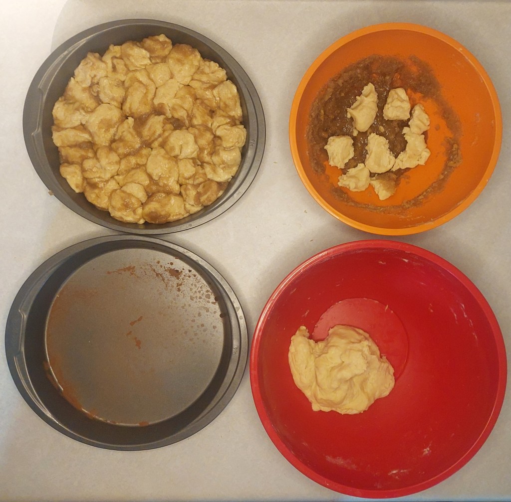 - Either dividing the dough or just tearing off pieces dip in butter-sugar mixture and place tightly together in either a 9×13 pan, 2 8 inch cake rounds, a Bundt pan or some other oven safe dish