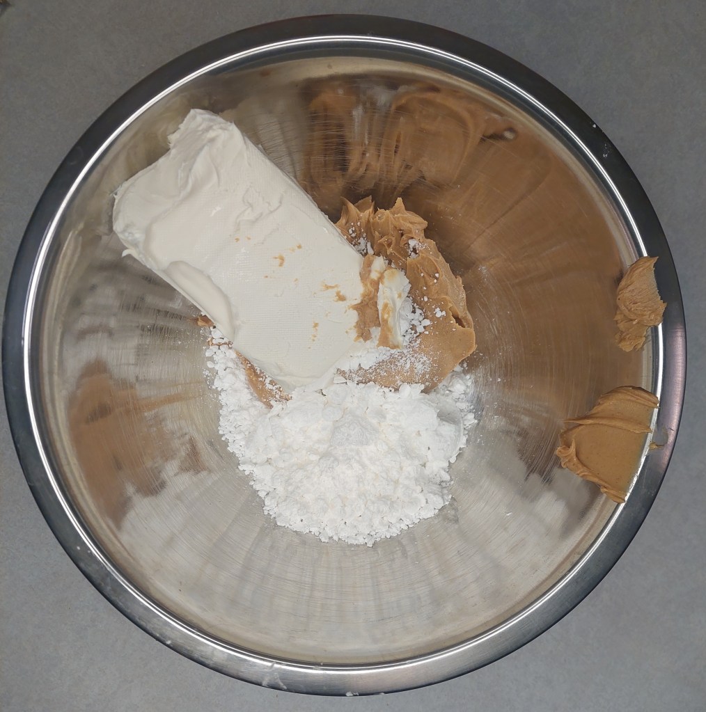 - Combine cream cheese, cup of powdered sugar and peanut butter in a bowl, mix until smooth/combined