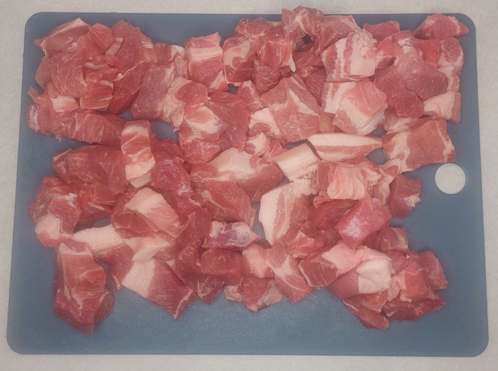 Chop your pork into roughly one inch cubes. Make sure that your pork isn’t too lean, we want to render some of the fat while we slow cook it.