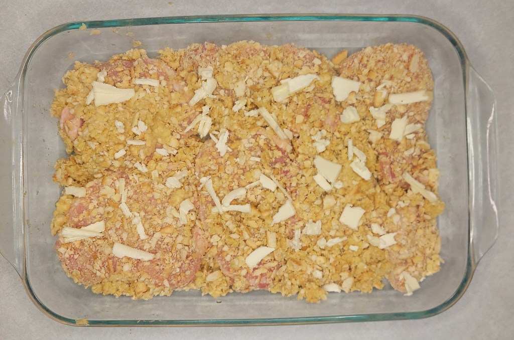 Add your butter in little pieces spread evenly over the top of your pork chops. It helps to bring out the flavor of the crackers and there isn’t much that isn’t improved by adding butter.